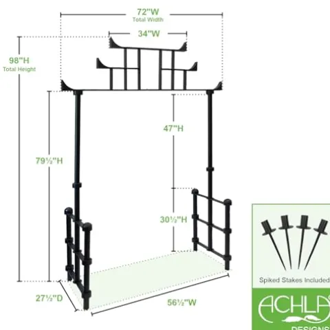 The Torii Arbor by ACHLA Designs brings a touch of elegance and tranquility to your outdoor space with its Japanese-inspired design, perfect for enhancing Asian-style gardens. This striking structure serves as a dramatic entryway or a captivating landscape feature, inviting guests into your garden sanctuary. Constructed from sturdy wrought iron with a sleek black powder-coated finish, it not only ensures durability but can also be repainted in traditional red to match your aesthetic. Assembly is a breeze, requiring just a screwdriver and including ground stakes for secure installation. With generous dimensions of 72 inches wide at the top and a 56 1/2-inch wide by 47-inch high opening, this arbor is both functional and visually appealing, making it an ideal addition to any landscape.