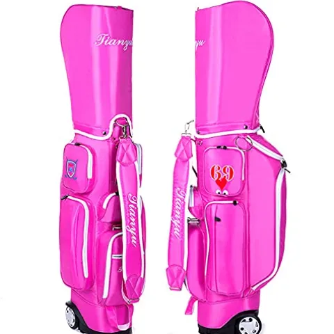 The ACXZ Golf Trolley Bag Carrying Bag with Wheels is a convenient and stylish choice for golf enthusiasts. Featuring 5-way dividers, this bag ensures that your clubs are organized and easily accessible. The umbrella buckle position provides additional functionality, while the 10cm wheels make it effortless to move around the course. With an adjustable shoulder strap for comfortable carrying and an extra storage pocket for gloves, balls, and personal items, this golf cart bag combines practicality with a touch of pink flair.