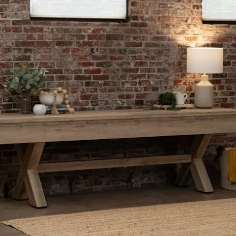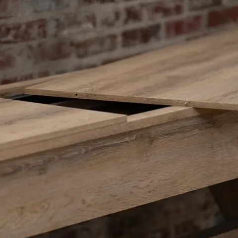 - TRANSITIONAL STYLING – Distressed white oak laminate, featuring a modern x-leg design, seamlessly blends into a variety of home décor settings, including game rooms, basements, and living rooms.