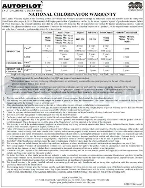 The AquaCal Autopilot DNP1 Digital Nano Plus 115-volt Salt Chlorine Generator is a reliable solution for maintaining a clean and healthy pool environment. This system, designed by AquaCal Autopilot, Inc., comes in a sleek white and blue color scheme. It features a 75042 Digital Nano Plus 115v Power Supply and 94106 RC28 Cell and Manifold Complete for efficient operation. With push-button controls and patented temperature compensation, this generator offers user-friendly functionality. The digital readout can display in multiple languages, making it accessible to a wide range of users. Easy to install and service, this generator is a convenient choice for pool owners looking for a hassle-free chlorination system.
