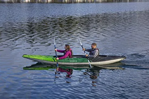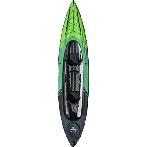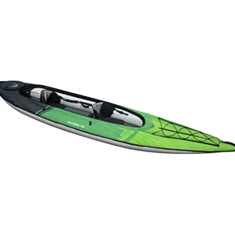 The AQUAGLIDE Navarro 145 Convertible Inflatable Kayak with Drop Stitch Floor in green is your ultimate touring companion for water adventures. This durable kayak is designed to handle various water conditions with its industry-leading drop stitched floors, zip-on decks, and Hex Shell covered pontoons. It offers versatility for 1-3 persons, weighing 40 lbs with a capacity of 500 lbs. Features like a quick release fin, Velcro seat adjustment, zip open dry compartments, and paddle keeper enhance the kayaking experience. AQUAGLIDE’s commitment to quality ensures that you get a high-performance inflatable kayak that is portable and built to last. Optional cover available for added protection.