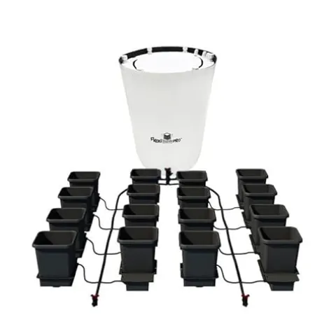 The AutoPot 16 Pot System is designed to streamline your hydroponic gardening experience while maximizing plant health and yield. Featuring 16 durable 3.9-gallon plastic pots, this self-watering and gravity-fed system ensures consistent moisture levels for your plants, eliminating the need for daily watering. Equipped with AIRBASES and AIRDOMES, it promotes optimal air and water distribution, enhancing root development and overall growth. The sleek black design complements any grow tent setup, while the 60-gallon PRO FlexiTank provides ample water supply for sustained operation. Perfect for both novice and experienced gardeners, the AutoPot system simplifies the process of growing lush, thriving plants with minimal effort.