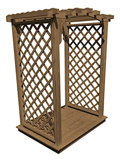 The Amish-Made Jamesport Style Pine Arbor is a stunning addition to any outdoor space, featuring a beautiful mushroom stain that enhances its natural wood grain. Handmade in the USA by skilled Amish craftsmen, this durable arbor measures 5 feet wide, providing an elegant walkthrough entry that stands at 81 inches tall. Constructed from pressure-treated Yellow Pine, it promises longevity and resilience against the elements. The arbor comes complete with four 17-inch stakes to ensure stability in firm soils, while its eco-friendly, soy-based stain showcases a commitment to sustainability. Transform your garden or patio into a picturesque retreat with this exquisite piece.