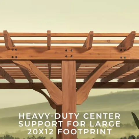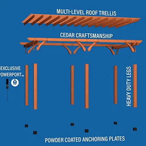 The Backyard Discovery Beaumont 20′ x 12′ Traditional Cedar Wood Pergola Kit is the ideal addition to your outdoor space, combining elegance with unmatched durability. Crafted from 100% cedar wood, it offers natural resistance to decay and features a timeless light brown stain that enhances any patio, deck, or garden. With a wind-resistant design tested to withstand gusts up to 100 mph, this pergola ensures your gatherings remain safe and enjoyable. The patented PowerPort provides convenient electrical outlets and USB ports, perfect for powering lights or devices. Installation is straightforward with pre-cut and pre-drilled components, and the robust construction, including dual structural cross beams and heavy-duty anchoring, guarantees long-lasting stability. Elevate your outdoor entertaining experience with this beautifully designed and functional pergola.