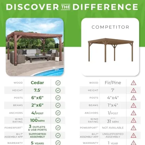 The Backyard Discovery Brockton 14′ x 10′ Modern Cedar Wood Pergola Kit combines style and functionality, making it an ideal addition to your outdoor space. Crafted from 100% cedar wood, it offers exceptional strength and natural decay resistance, while the rich dark walnut stain adds a contemporary touch. Designed for durability, this pergola withstands winds up to 100 mph, ensuring stability with its heavy-duty resin feet and concealed concrete anchors. The innovative PowerPort features three electrical outlets and three USB ports, perfect for powering your outdoor activities. With pre-cut, pre-drilled, and pre-stained components, along with easy-to-follow instructions via the interactive BILT app, installation is a breeze. Enhance your patio, deck, or garden with a structure that not only elevates your outdoor entertaining but also comes with a reassuring 5-year warranty.