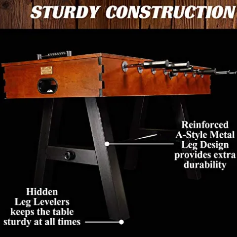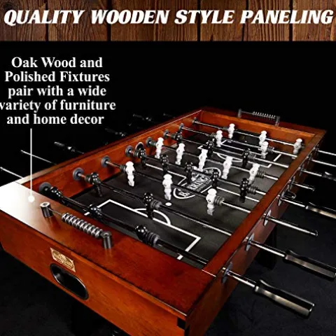 - COMPETITIVE SIZE FOOSBALL TABLE: Prepare for fierce competition. This 56” gaming table has a spacious 46.75″x26.5″ playfield. Its sturdy construction and wooden-style paneling ensure it’s not just a game table but a decorative centerpiece in any game room.