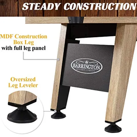 - CRAFTSMANSHIP: The apron of this Modern Industrial-style table game is made of MDF and has a PVC laminated wood grain finish, the table corner caps are color-matched plastic, and the box legs and leg panels are made of MDF.