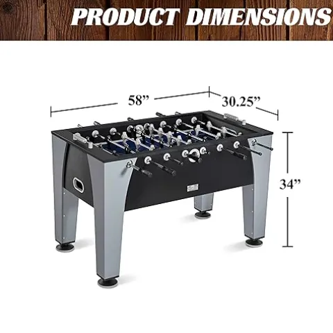 - COMPETITIVE SIZE FOOSBALL TABLE: This 58” long game table has a playfield that’s 46.75″x26.75″ for playing competitive foosball games. With durable construction and modern gray carbon fiber lamination, this game table will look great in almost any game room.