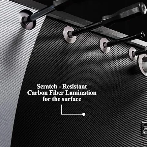 - CRAFTMANSHIP: The foosball table is made of MDF and has a scratch-resistant PVC laminated carbon fiber finish. Goal boxes return your tabletop soccer ball after each goal and the score is tracked with traditional bead style scorers.