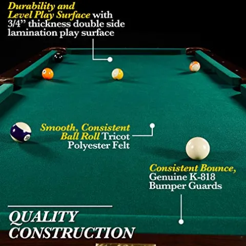 - ACCESSORIES INCLUDED: This pool table comes with a complete set of billiard accessories to start playing right away and includes one set of 2.25” billiard balls, two 57” cue sticks, one triangle, two chalks, and one brush