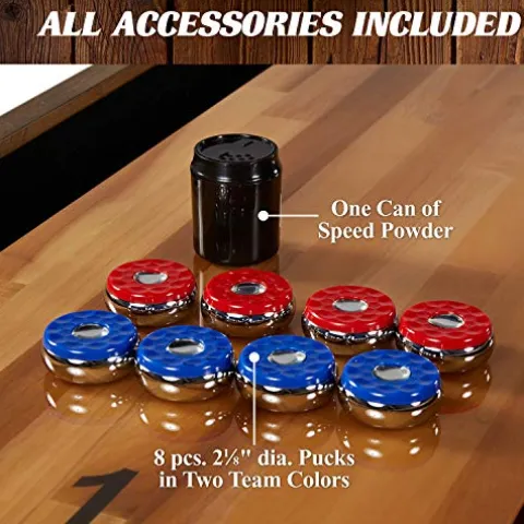 - PLAYING SURFACE: The 12-foot (144”) long table has a durable playfield made of 1.75” (45mm) thick solid wood in a butcher block design, with a scratch-resistant poly coating to provide smooth fast puck action for your shuffleboard game experience