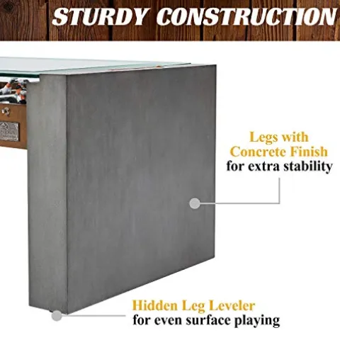 - STURDY MODERN LEGS – The legs have a Faux concrete finish over MDF in a modern style, offering needed stability during play. The legs feature adjustable .75” hidden leg levelers for an even playing surface during intense soccer matches.