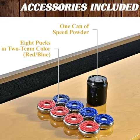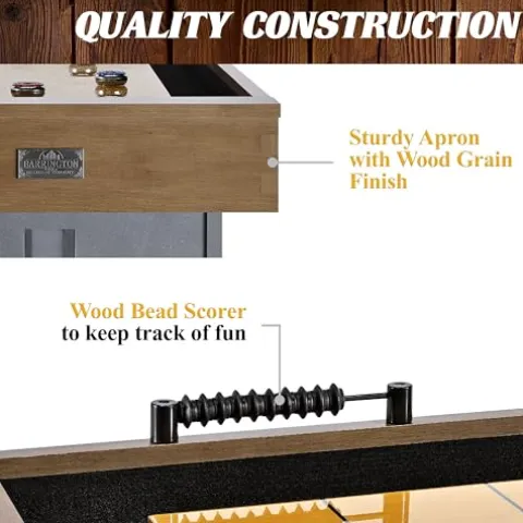 - PLAYING SURFACE: The 9-foot (108”) long table has a durable playfield made of 1.5” (36 mm) thick engineered wood that is UV-coated, and scratch-resistant to provide smooth fast puck action for your shuffleboard game experience.
