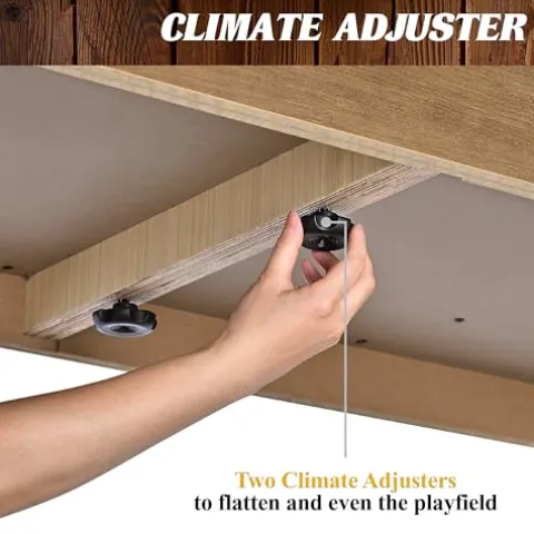 - TABLE DESIGN: This table has 1.5” hidden leg levelers, and under-table Climate Adjusters (wing bolts) to even the playfield, it has 2 bead-style slide scorers, and carpet-lined gutters and side walls to reduce noise and protect the playing surface.