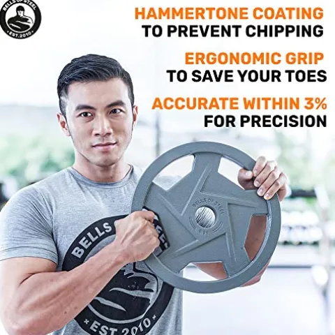 Enhance your weightlifting game with the Bells of Steel Mighty Grip Cast Iron Olympic Weight Plates. These semi-gloss 2-inch weight plates feature precision grip handles, making loading and re-racking a breeze. The premium hammertone powder coat finish ensures durability and resistance to chipping, guaranteeing years of use. With a +/- 3% weight tolerance and 425lb set including various plate sizes, this set is designed to meet your lifting needs. Backed by a 5-year warranty and a satisfaction guarantee, these weight plates are a reliable choice for any fitness enthusiast.