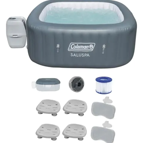 Transform your backyard into a luxurious retreat with the Bestway Coleman Hawaii AirJet Inflatable Hot Tub, featuring a sophisticated gray design. This exceptional spa package includes a SaluSpa Spa Seat with adjustable legs and four plush headrest pillows, ensuring every soak is a personalized escape. Enjoy the soothing embrace of 140 bubbling jets, capable of accommodating 4 to 6 people, and reach relaxation perfection with water temperatures up to 104°F. The square design offers a seamless blend of style and comfort, while the contoured spa seats provide unwavering support. Experience the pinnacle of outdoor relaxation with this complete spa set, perfect for unwinding after a long day.