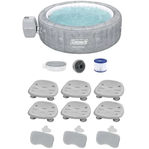 Enjoy the ultimate relaxation experience with the Coleman SaluSpa Sicily 180 Soothing AirJet Inflatable Hot Tub by Bestway. This round hot tub can accommodate 5 to 7 people and features 180 jets that release warm air into the water, providing a soothing massage experience. The Freeze Shield automatic heating function prevents freezing, while the digital control panel allows you to adjust the temperature up to 104 degrees Fahrenheit. Constructed of durable DuraPlus materials, this hot tub has cushioned floors and a ChemConnect chemical dispenser for clean, healthy water. Additionally, the 6-pack of Bestway SaluSpa Spa Seats and 3 sets of SaluSpa Padded Headrest Pillows offer comfort and customization, ensuring a luxurious spa experience every time.
