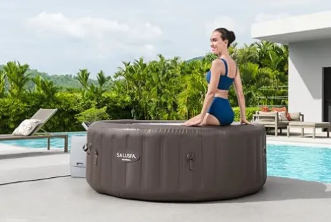 Experience the ultimate relaxation with the Bestway SaluSpa Dominica Smart EnergySense HydroJet Inflatable Hot Tub Spa in Mousse color. This portable spa for up to 6 people offers a luxurious hot tub experience with 140 AirJet massage bubbles and 4 HydroJet spa nozzles, reaching up to 104ºF (40ºC). Featuring an EnergySense cover that is up to 40% more energy-efficient than similar models, this spa allows for extended heating while keeping energy costs low. Control the spa effortlessly with the Bestway Smart Hub App, enabling temperature adjustments, Power Saving Timer activation, water filtration, and massage system control from your smart device. With durable MaxHold fabric internal beams and a 3-layer DuraPlus outer layer, this spa is puncture-resistant and maintains its shape over time. Easy to set up and use, this spa includes a pump, cup holders, and a ChemConnect dispenser for clean, healthy water maintenance. APSP-14 and Title 20 compliant, this model meets energy efficiency requirements in select states for your peace of mind.