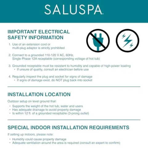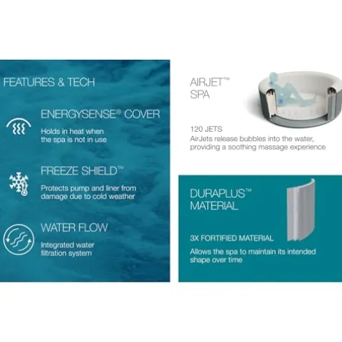 - Equipped with a pump that inflates the spa and more for a convenient spa that includes a cover, spa pump, chemical floater, 2 filter cartridges (VI), 1 repair patch, and a 6-foot-long cord