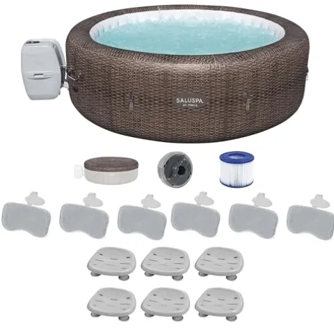 Transform your backyard into a tranquil retreat with the Bestway SaluSpa St Moritz AirJet Hot Tub. This round, 2 to 7-person spa boasts a soothing massage system, rapid heating, and integrated water filtration for quick relaxation. The built-in AirJet system with 180 jets envelops you in a serene bubble massage. The set includes 6 non-slip pool and spa seats and 6 padded headrest pillows with adjustable straps, offering unparalleled comfort and support. Unwind at the end of the day in luxury with this ultimate relaxation oasis in your own home.