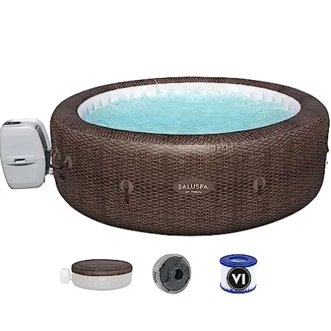 - Bundle set includes a SaluSpa canopy for added protection from the sun that attaches to the 85 by 28-inch St. Mortiz SaluSpa inflatable 7-person hot tub with a soothing massage system, rapid heating, and integrated water filtration