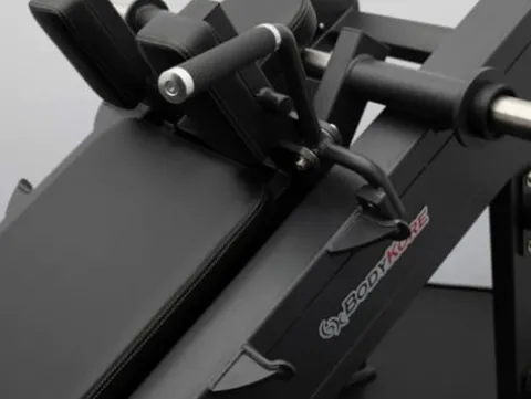 The Adjustable Hack Squat FL1811 by BK BodyKore in Silver and Black offers a premium workout experience with its super-smooth movement along the carriage. Designed for safety and convenience, this hack squat machine features guided motion and safety locking points to eliminate the need for a spotter. Crafted from ergonomically designed oval, 11-gauge steel for a modern look and superior stability, it ensures a comfortable and secure workout session. With case hardened rods and high-quality bearings, this machine guarantees smooth performance at any weight, while the four Olympic weight plate storage posts allow for easy access and organization of plates. Elevate your leg workout routine with this durable and efficient hack squat machine.