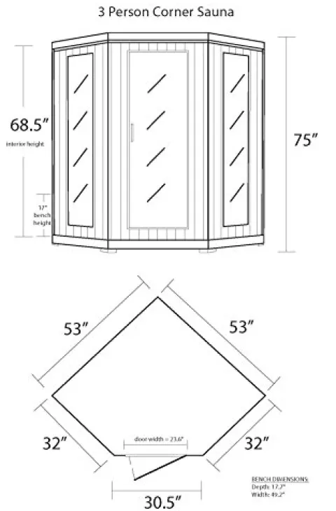 Experience ultimate relaxation and luxury with the Blue Wave 3-Person Hemlock Corner Infrared Sauna in Brown. Crafted from high-quality Canadian hemlock wood, this sauna features a scratch-resistant glass door and three comfortable backrests for a stylish and comfortable experience. Enjoy the soothing heat from seven carbon heaters and customize your ambiance with the chromotherapy system. This sauna comes equipped with a stereo sound system, air purifier, towel and magazine rack, and easy-to-use LED controls for a complete spa-like experience. With dimensions of 53″ W x 53″ D x 75″ H, and an extensive manufacturer warranty, including seven years on wood and structure, this sauna is the perfect addition to your home for relaxation and wellness.