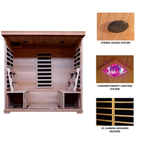 - FAR INFRARED HEAT – Nine low-EMF carbon heaters are strategically positioned to provide a continuous curtain of restorative warmth. FAR infrared heating permeates deep into your body, increasing your core temperature and relieving muscle and joint pain.