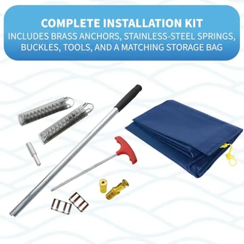 - COMPLETE INSTALLATION KIT AND WARRANTY – The cover includes brass anchors, stainless-steel springs, buckles, and tools, along with an off-season storage bag. Backed by an 18-year prorated warranty, with full coverage within the first year.