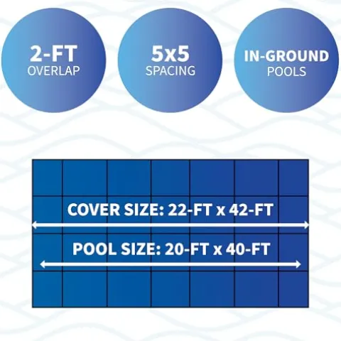 The Blue Wave 20-ft x 40-ft Rectangular In Ground Pool Safety Cover offers unmatched strength and security for your pool. Engineered with robust two-ply mesh, this cover can withstand over 4000 lbs of pressure, making it perfect for enduring harsh winters. Its 5×5 spacing design, reinforced straps, and heavy-duty brass anchors ensure superior safety, preventing pets and children from accidental falls. Efficient water drainage through its fine mesh keeps the cover free from water accumulation, simplifying spring cleanup. With a 2-foot overlap and wear-resistant strips, it provides comprehensive winter protection. This cover comes complete with an installation kit and an off-season storage bag, all backed by an 18-year prorated warranty, offering full coverage in the first year. Enjoy peace of mind with the sleek and secure Blue Wave safety cover.