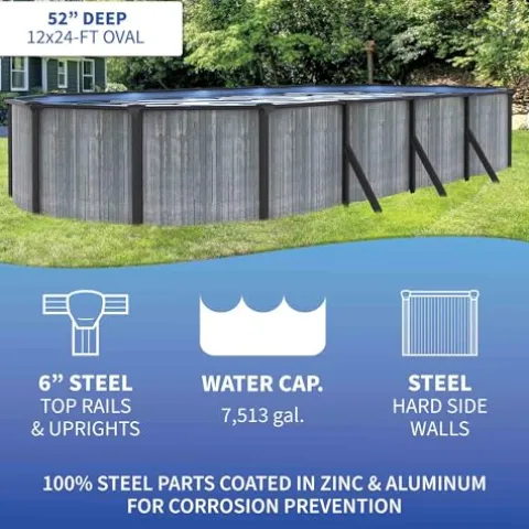 Create your backyard oasis with the Blue Wave San Pedro 12×24-ft Oval Above Ground Steel Wall Swimming Pool Package. Built to last with hot dip galvanized steel and zinc-aluminum coating, this pool offers unrivaled rustproofing. The Sandman Filtration System ensures crystal clear water while being energy efficient. Safety is a top priority with the included resin ladder supporting up to 250 lbs and featuring a secure locking mechanism. This package comes complete with essentials for setup and maintenance, including a liner, skimmer, filter system, ladder, and maintenance kit. Backed by a 15-year limited warranty, the San Pedro Pool promises lasting memories for years to come.