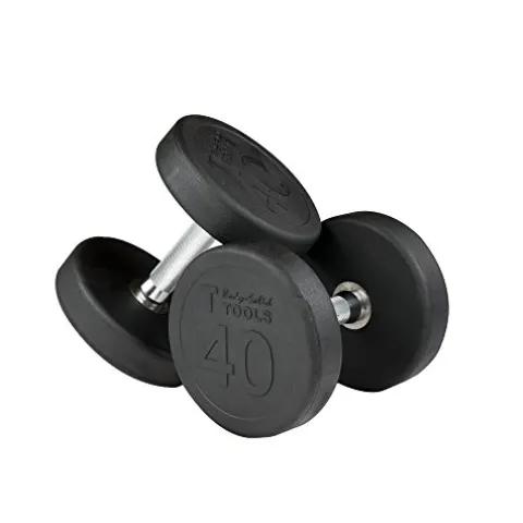 The Body-Solid Round Rubber Dumbbell 5-40 lb. Pairs Package with Rack offers a comprehensive set of 8 pairs of dumbbells ranging from 5 to 40 lbs., totaling 360 lbs. in weight. These round rubber dumbbells are designed with chrome-plated solid steel handles for durability and a comfortable grip. The package includes the Body Solid Dumbbell Rack GDR363 for convenient storage and organization, along with a floor mat for added protection. Ideal for strength training and muscle building, this package is a versatile and essential addition to any home or commercial gym setup.