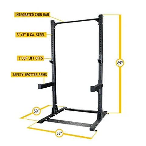- PRECISION DESIGN FOR TOTAL PERFORMANCE: Our Half Rack boasts laser-cut numbers, premium J-cup liftoffs, safety spotter arms, and an integrated chinning bar for pull-ups, chin-ups, and upper body development. With spotter arm hole spacing every 1”, users can achieve the perfect stretch without compromising safety.
