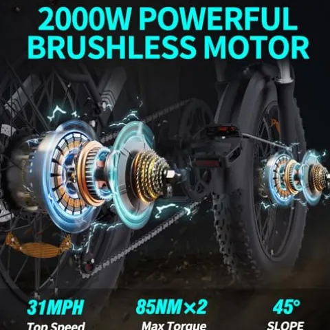 - 【𝟐𝟎𝟎𝟎𝐖 𝐃𝐮𝐚𝐥 𝐌𝐨𝐭𝐨𝐫】The H20 Pro fat tire electric bike features a powerful 1000W front and 1000W rear brushless motor, reaching a top speed of 31 mph in just 0-3 seconds,delivering a maximum torque of 85*2NM, conquering 45° inclines with ease.