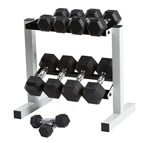 - Set contains 5 to 25 pound dumbbells with 20 Inch rack for easy storage