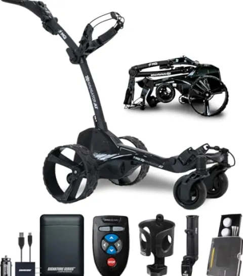 - BUNDLE INCLUDES: MGI Zip Navigator AT Electric Caddie Golf Cart, Drink Holder, Umbrella Holder, Scorecard Holder, Multi-Purpose Clip, and Signature Series Power Bundle
