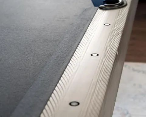 Enhance your game room with the Smoky Mountain Nights 7′ Pool Table from Chamberlain Game Tables. Crafted with a real wood frame in a rustic grey hue, this table exudes quality and style. Handcrafted by skilled artisans, it features dove tail fitted and finished corners for durability. The 60% wool felt ensures a tournament-grade roll, while the professional “K55” rubber cushion table rails provide optimal bounce. Complete with top grain leather pool ball drop pockets and designer metal hex head pattern rail sights, this pool table is a perfect blend of functionality and elegance.