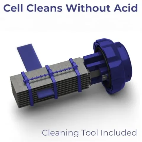 - CONVENIENT, EASY MAINTENANCE: Self-cleaning reverse polarity cell. Cell design & included cleaning tool make it one of the only models available that doesn’t require acid-cleaning of the cell.