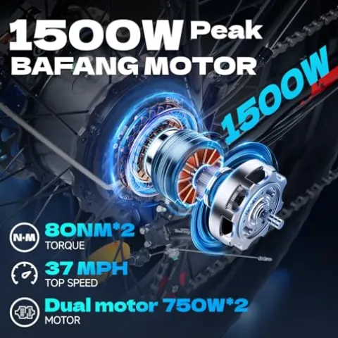 - 🚴【Dual Motor 1500W】Cleytro Electric Bike for Adults. This electric bicycle uses two hub motors with a total output of 1500W, which can provide powerful acceleration capabilities, with a top speed of 37MPH and a peak torque of 80N·M*2, making it easy to climb hills. Whether you’re riding mountain trails, the beach, snow or city streets, Cleytro electric bikes deliver exceptional performance.