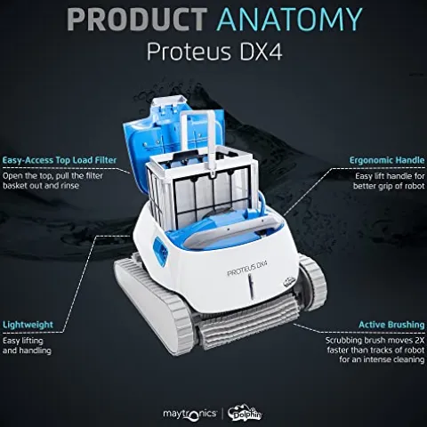 - WALL-SCRUBBING POWER: Dolphin Proteus DX4 climbs walls efficiently, ensuring thorough cleaning on any pool surface, no matter the shape or surface type.
