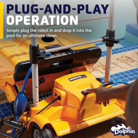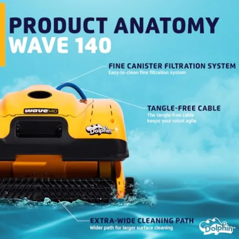 - The Dolphin Wave 140 commercial robotic pool vacuum cleaner excels in thorough floor cleaning, leaving no debris or dirt behind. The Dolphin Wave 140 features agile steering with Dual Drive, strategic movement helps navigate around obstacles easily. Easily move and store your Dolphin with the included Multi-Purpose Caddy. The auto-release cable system keeps your robot cable organized, while the Caddy makes it easy to move your Dolphin around the pool area.