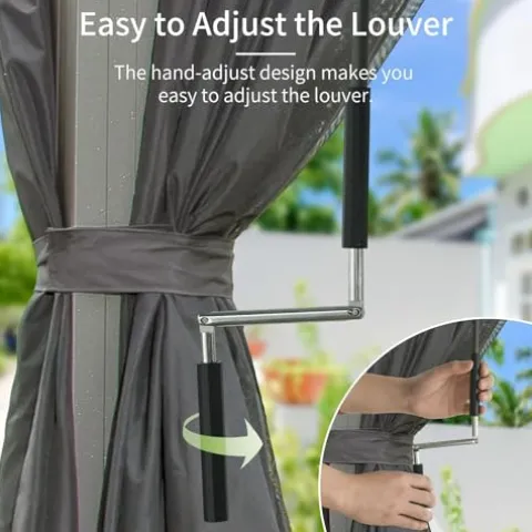 - Two Independent Adjustable Louvered Roof – This adjustable louvered pergola is equipped with an easy-to-use crank system that allows you easily adjust the louver angle from 0° to 90°. You control the amount of sunlight, ventilation, and shade.