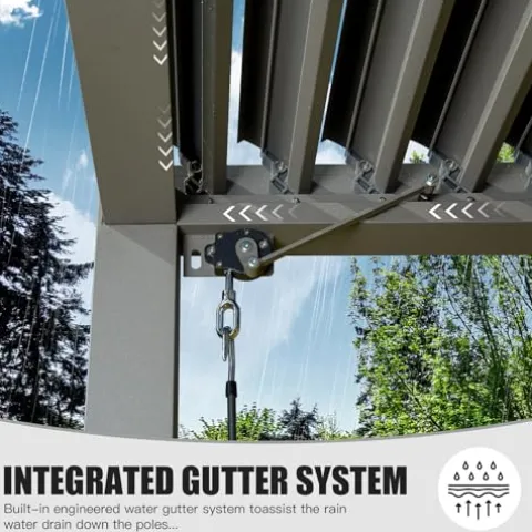 - Hidden Gutter System – This outdoor louvered pergola 10×13 designed with a built-in gutter system along the roof to drain away water,avoiding water accumulation on the top, ensures a clean and dry environment for your outdoor space.
