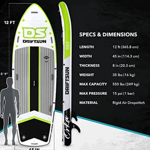 - PADDLEBOARD DIMENSIONS: Fully inflated, this ISUP is 12ft long, 45in wide and 8in thick. The Driftsun Cruiser inflatable SUP has a max weight capacity of 550lbs (rider and gear total). This board is ideal for beginners and intermediate paddlers
