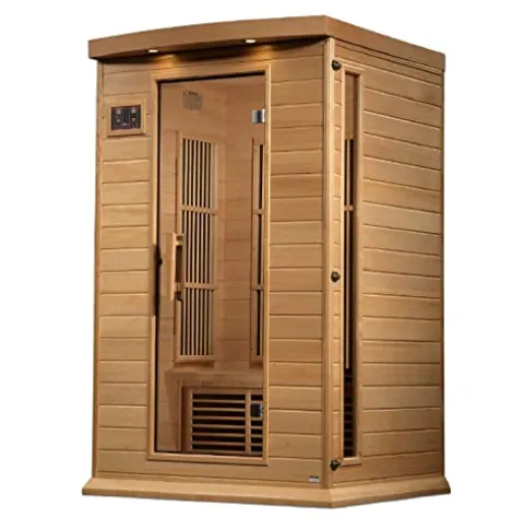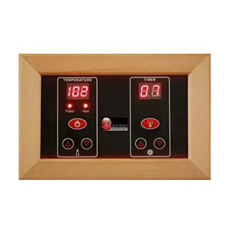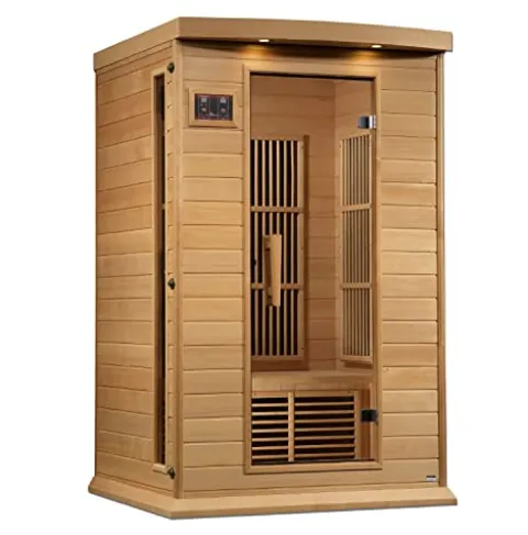 Elevate your wellness experience with the DYNAMIC SAUNAS Maxxus MX-K206-01 Elite 2-Person Near Zero EMF FAR Infrared Sauna. Crafted from natural reforested Canadian Hemlock, this sauna boasts a sleek natural wood finish and comfortably accommodates two people. Engineered for safety, it features six PureTech Near Zero EMF carbon heating panels, ensuring minimal EMF exposure while delivering soothing heat up to 140F. Enjoy a personalized ambiance with the chromotherapy color lighting system, alongside exterior accent lighting for an enhanced atmosphere. Stay entertained with the built-in FM radio, Bluetooth, and MP3 auxiliary connection. Delivered curbside on a pallet for your convenience, this sauna combines luxury, safety, and modern technology for an unparalleled relaxation experience.