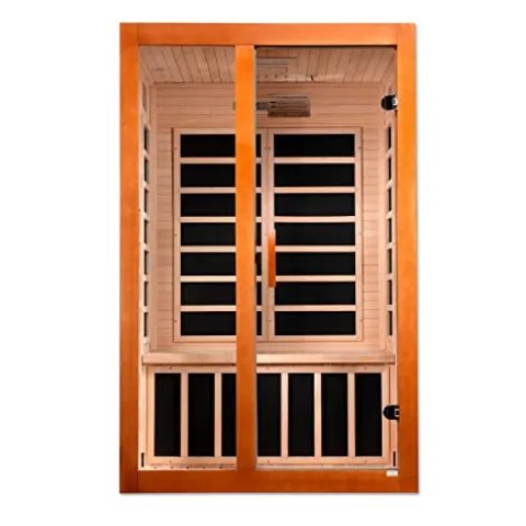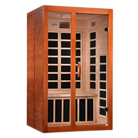 Experience the ultimate relaxation with the Dynamic Santiago Elite Honey Stain Finish 2-Person Ultra Low EMF FAR Infrared Sauna by DYNAMIC SAUNAS. Featuring 7 Carbon PureTech heating elements for a soothing sauna experience, this sauna boasts exterior dimensions of 46″ x 40″ x 75″, providing ample space for two individuals. Enjoy your favorite tunes with the built-in Music System Bluetooth and immerse yourself in the ambient lighting provided by the interior LED control panel and chromotherapy lighting system. Elevate your wellness routine with this luxurious and therapeutic sauna experience.