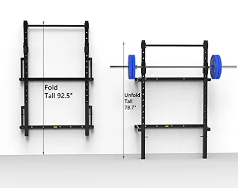- Wall-mounted squat rack takes up very little wall space, fold up and down design, join your garage or small space gym