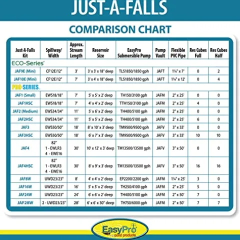 - Kit includes flexible PVC pipe, Waterfall spillway, EasyPro pump vault, Submersible pump and WIK installation kit