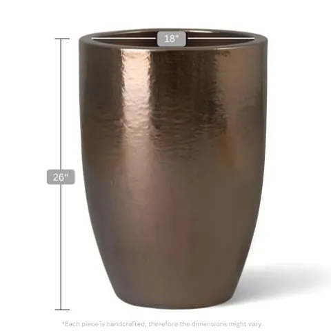 The Emissary 18in. L x 26in. H Gold Stoneware Round Planter combines exquisite craftsmanship with functionality to elevate any indoor or outdoor space. Handcrafted from durable stoneware, this luxurious planter features a stunning gold color with a glossy glaze finish that adds a touch of sophistication to your decor. Designed with eco-friendliness in mind, it utilizes local resources to minimize its carbon footprint. Additionally, integrated drainage holes ensure optimal plant health by preventing water build-up and root rot, making it the perfect choice for both novice and experienced gardeners. Enhance your botanical collection with this elegant planter that marries beauty and practicality.