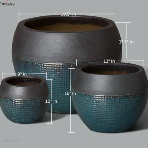 The Emissary 22-inch L x 17.5-inch H Matte Black/Teal Stoneware Round Planters (Set of 3) effortlessly combines style and functionality, making them an ideal addition to any indoor or outdoor space. Handcrafted with high-quality stoneware, these durable planters feature an eco-friendly design that utilizes local resources, significantly reducing your carbon footprint. The striking matte black and teal color scheme, complemented by a semiglossy glaze finish, adds a touch of sophistication to your decor. Equipped with drainage holes, these planters promote healthy plant growth by preventing water build-up and root rot, ensuring your greenery thrives beautifully.